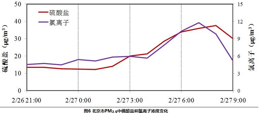 同時(shí),26日夜間北京市PM2.5中硫酸鹽組分濃度快速上升,27日早晨硫酸鹽質(zhì)量濃度高達(dá)約40微克/立方米,占PM2.5總質(zhì)量的20%左右,氯離子濃度也呈現(xiàn)同步增長趨勢(shì),結(jié)合上述分析,指示了區(qū)域燃煤污染傳輸?shù)挠绊?;再疊加本地機(jī)動(dòng)車等污染源排放的累積,北京市PM2.5濃度快速上升,在27日凌晨至上午達(dá)到重污染水平(圖6)。