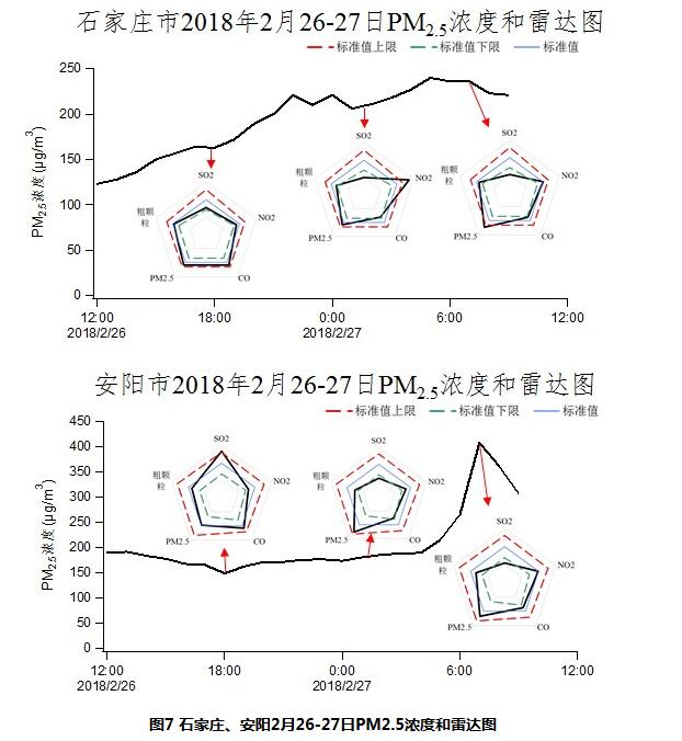 此外,污染物特征雷達(dá)圖也顯示(圖7),區(qū)域內(nèi)污染較重的石家莊和安陽等城市總體呈現(xiàn)受山前靜穩(wěn)天氣等不利氣象條件影響、本地污染物排放累積的特征。