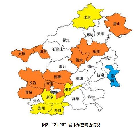 截止2月27日,京津冀及周邊地區(qū)共30個(gè)城市啟動(dòng)預(yù)警響應(yīng),其中15個(gè)城市發(fā)布橙色預(yù)警,14個(gè)城市發(fā)布黃色預(yù)警,1個(gè)城市發(fā)布藍(lán)色預(yù)警?!?+26”城市中有15個(gè)城市發(fā)布重污染天氣應(yīng)急響應(yīng),9個(gè)城市發(fā)布橙色預(yù)警,5個(gè)城市發(fā)布黃色預(yù)警,1個(gè)城市發(fā)布藍(lán)色預(yù)警(圖8)