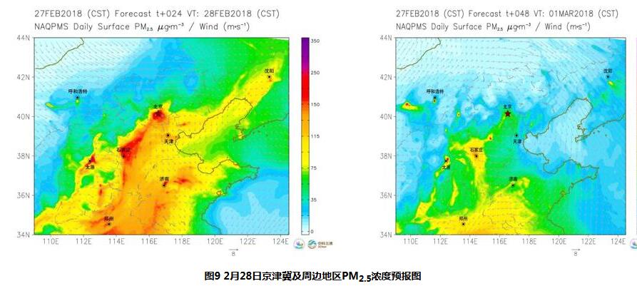 因東北高壓系統(tǒng)南下受阻,27日白天冷空氣過程顯著偏弱,京津冀中部污染過程預(yù)計(jì)將持續(xù)至28日。受區(qū)域性弱風(fēng)、高濕及逆溫等不利氣象條件影響,京津冀中南部、山西南部、山東西部和河南北部可能出現(xiàn)中至重度污染過程,影響范圍主要包括北京、天津、石家莊、保定、衡水、邢臺(tái)、邯鄲、晉城、濟(jì)南、德州、淄博、聊城、鄭州、安陽、鶴壁、焦作、新鄉(xiāng)、濮陽等城市,部分城市可能達(dá)到嚴(yán)重污染,PM2.5小時(shí)濃度峰值可能達(dá)到或超過350微克/立方米。28日夜間至3月1日凌晨,受冷空氣過程影響,包括北京、天津在內(nèi)的京津冀中部城市群空氣質(zhì)量有望改善(圖9)。