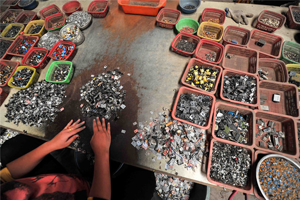 上世紀80年代末,廣東貴嶼鎮(zhèn)開始涉及舊五金電器的拆解生意,由于獲利豐厚,整個行業(yè)規(guī)模逐漸擴大。圖為一名工人正在分揀電子組件(圖:中新社)
