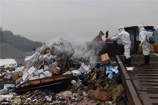 2017年3月29日,在重慶出入境檢驗檢疫局監(jiān)督下,總重約30噸的過期、殘次、不合格跨境電子商務產(chǎn)品集中在重慶黑石子垃圾處理場進行無害化銷毀。 圖為工作人員對銷毀產(chǎn)品進行無害化處理(圖:中新社)