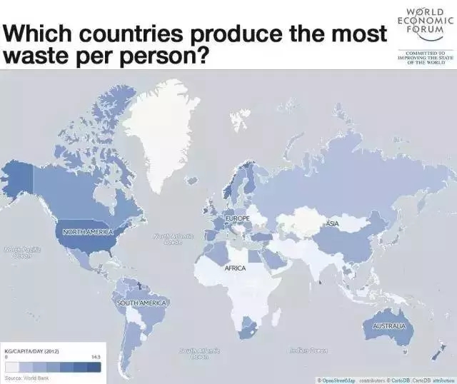 來(lái)自世界經(jīng)濟(jì)論壇的一張全球人均生產(chǎn)垃圾分布地圖顯示,人均垃圾生產(chǎn)量(單位:公斤/天)排名前五位的均為發(fā)達(dá)國(guó)家:新西蘭(3.68),愛(ài)爾蘭(3.58),挪威(2.8),瑞士(2.61),美國(guó)(2.58),而中國(guó)人均垃圾生產(chǎn)量基本維持在世界平均水平——1.2。