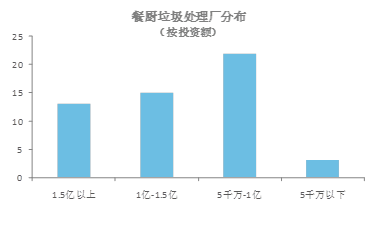 據(jù)E20數(shù)據(jù)中心不完全統(tǒng)計,目前在庫餐廚項目處理規(guī)?;咎幱?00噸/日及以下,且50-100噸/日處理規(guī)模占比最多;投資額1億元以下的餐廚廠占比約一半。從投資額與處理規(guī)模看,餐廚垃圾廠在市政基礎(chǔ)設(shè)施投資建設(shè)中處于適中位置。