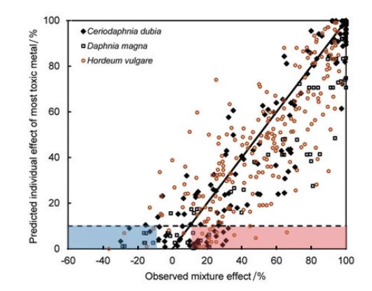 圖2重金屬復合污染條件下模型預測和觀測的毒性對比