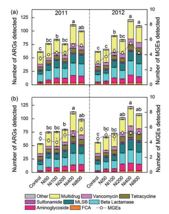 抗生素對細菌感染、致病微生物感染類疾病的防治具有重要作用,但由此而來的抗性基因的快速增加和傳播也威脅著人體健康??剐曰虻难芯吭桨l(fā)受到學者關(guān)注,成為研究熱點。除抗生素選擇產(chǎn)生抗性基因外,環(huán)境中重金屬對抗生素抗性的選擇和傳播擴散具有重要作用。中國科學院生態(tài)環(huán)境研究中心Hu等通過對Ni長期污染土壤誘導的抗性基因進行研究,發(fā)現(xiàn)在長期不同程度Ni污染下,共檢測到149種抗性基因,以多藥和β-內(nèi)酰胺類抗生素抗性為主,抗性基因的頻率和豐度隨Ni污染程度的增加而升高(圖3);抗性基因與可移動抗性原件具有顯著相關(guān)性,表明Ni污染增加了抗性基因的水平轉(zhuǎn)移,該水平轉(zhuǎn)移與intI1整合子有關(guān)。區(qū)別于以往重金屬的直接毒性風險,該研究闡述了重金屬在土壤環(huán)境中的間接風險-增加抗性基因產(chǎn)生和傳播風險。