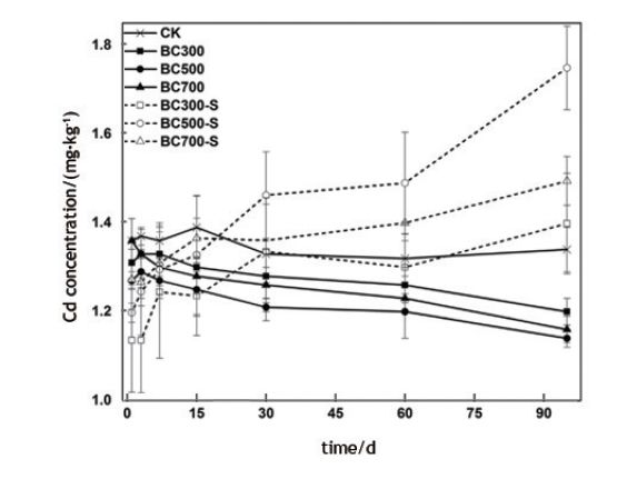 圖8不同培養(yǎng)時間下生物炭(BC300,BC500,BC700)和改性生物炭(BC300-S,BC500-S,BC700-S)對土壤全量Cd濃度變化的影響