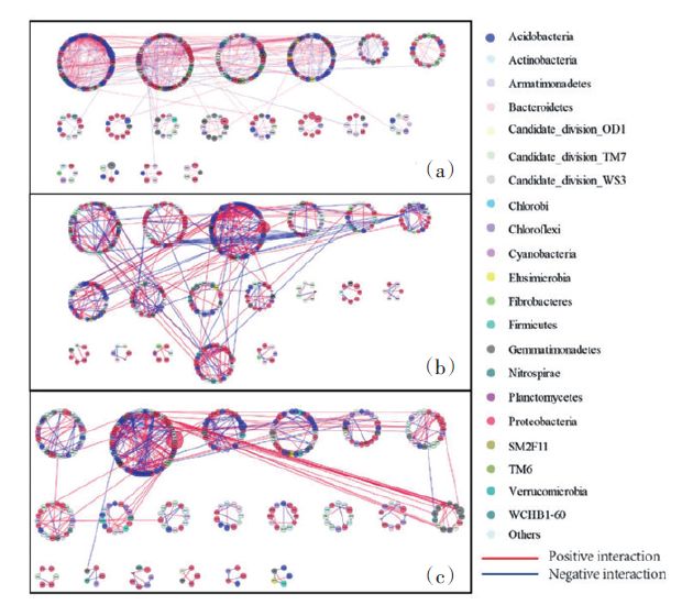 圖9不種植物(a)和種植大豆(b)與玉米(c)對鎘污染土壤細菌網(wǎng)絡(luò)關(guān)系的影響
