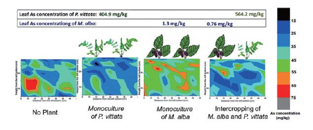 除降低可食作物對重金屬吸收外,在重金屬污染土壤上種植經(jīng)濟作物,阻控重金屬在食物鏈中的傳遞風險,也是污染農(nóng)田安全利用的措施之一。華中農(nóng)業(yè)大學Yang等針對重金屬污染土壤研究重金屬耐性經(jīng)濟作物3種種植模式(油菜-向日葵、油菜-花生、油菜-芝麻),對土壤重金屬去除效應和農(nóng)作物中重金屬濃度的影響進行了研究。結(jié)果表明,油菜-向日葵種植模式去除Cd最高,可達459g˙ha-1,去除率為1.98%;利用正己烷提取后作物油符合相應標準,去油后種子殘渣再經(jīng)酒石酸鉀提取后,其重金屬濃度低于飼料標準。經(jīng)濟作物與超積累植物間作,在安全生產(chǎn)的同時也能去除土壤污染物,實現(xiàn)修復目的。但是在超積累植物和其他植物間作體系下,超積累植物對重金屬活化和吸收機制還不清楚,超積累植物是否活化重金屬,增加非超積累植物對重金屬吸收。中國科學院地理科學與資源研究所Wan等開展了As超積累植物蜈蚣草和桑樹間作的研究,探討了邊生產(chǎn)邊修復機制。與單作相比,間作處理條件下蜈蚣草中As濃度顯著增加、桑樹As則顯著降低;對不同處理下土壤As的空間分布分析發(fā)現(xiàn),不論單作或間作處理蜈蚣草根周圍土壤As濃度較低,沒有活化土壤As(圖10),且在間作處理下桑樹葉中As濃度符合國家飼料標準。