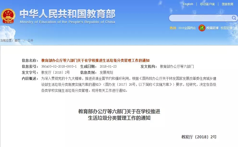 為深入貫徹黨的十九大精神,推進(jìn)資源全面節(jié)約和循環(huán)利用,根據(jù)《國(guó)務(wù)院辦公廳關(guān)于轉(zhuǎn)發(fā)國(guó)家發(fā)展改革委住房城鄉(xiāng)建設(shè)部生活垃圾分類(lèi)制度實(shí)施方案的通知》(國(guó)辦發(fā)〔2017〕26號(hào),以下簡(jiǎn)稱《實(shí)施方案》)要求,經(jīng)研究,決定在各級(jí)各類(lèi)學(xué)校實(shí)施生