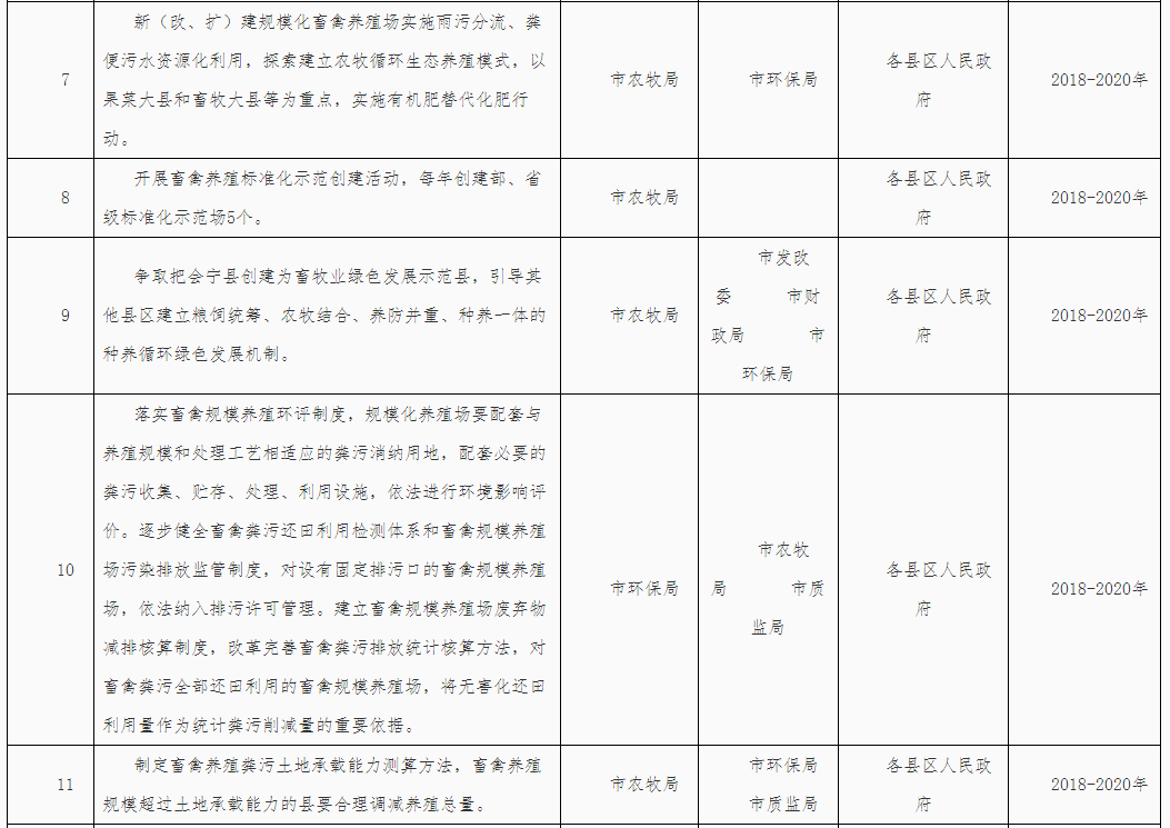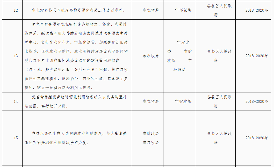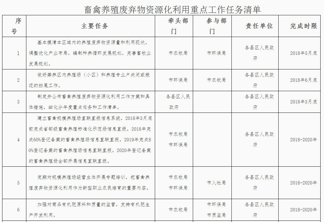 (三)落實(shí)屬地管理責(zé)任。落實(shí)“菜籃子”市長負(fù)責(zé)制,堅(jiān)持保供給與保環(huán)境并重,統(tǒng)籌畜產(chǎn)品供給和畜禽糞污治理。各縣區(qū)政府對本行政區(qū)域內(nèi)的畜禽養(yǎng)殖廢棄物資源化利用工作負(fù)總責(zé),要結(jié)合本地實(shí)際,依法明確部門職責(zé),構(gòu)建責(zé)任體系,健全工作機(jī)制,加大資金投入,完善政策措施,強(qiáng)化日常監(jiān)管,確保各項(xiàng)任務(wù)落實(shí)到位。各縣區(qū)人民政府應(yīng)于2018年3月底前制定并公布畜禽養(yǎng)殖廢棄物資源化利用工作方案,細(xì)化分年度的重點(diǎn)任務(wù)和工作清單,并抄送市農(nóng)牧局備案。