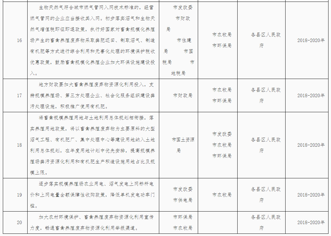 (五)推動(dòng)種養(yǎng)循環(huán)發(fā)展。各縣區(qū)要盡快編制種養(yǎng)循環(huán)發(fā)展規(guī)劃,引導(dǎo)建立糧飼統(tǒng)籌、農(nóng)牧結(jié)合、養(yǎng)防并重、種養(yǎng)一體的種養(yǎng)循環(huán)綠色發(fā)展機(jī)制,促進(jìn)畜牧業(yè)持續(xù)健康發(fā)展。推動(dòng)建立畜禽糞污等農(nóng)業(yè)有機(jī)廢棄物收集、轉(zhuǎn)化、利用網(wǎng)絡(luò)體系,支持采取政府和社會(huì)資本合作(PPP)模式,調(diào)動(dòng)社會(huì)資本在養(yǎng)殖密集區(qū)域建立糞污集中處理中心,探索規(guī)模化、專業(yè)化、社會(huì)化運(yùn)營機(jī)制,加快畜禽糞污處理全產(chǎn)業(yè)鏈建設(shè)。培育壯大多種類型的糞污處理社會(huì)化服務(wù)組織,實(shí)行專業(yè)化生產(chǎn)、市場化運(yùn)營。鼓勵(lì)建立受益者付費(fèi)機(jī)制,保障第三方處理企業(yè)和社會(huì)化服務(wù)組織合理收益。加強(qiáng)糞肥還田技術(shù)指導(dǎo),鼓勵(lì)沼液和經(jīng)無害化處理的畜禽養(yǎng)殖廢水作為肥料科學(xué)還田利用。優(yōu)先支持現(xiàn)代農(nóng)業(yè)示范區(qū)、農(nóng)業(yè)可持續(xù)發(fā)展試驗(yàn)示范區(qū)和現(xiàn)代農(nóng)業(yè)產(chǎn)業(yè)園在田間地頭配套建設(shè)管網(wǎng)和儲(chǔ)糞(液)池等方式,解決糞肥還田“最后一公里”問題。到2020年新(改擴(kuò))建大中型沼氣21處,新(改擴(kuò))建有機(jī)肥生產(chǎn)企業(yè)5家。