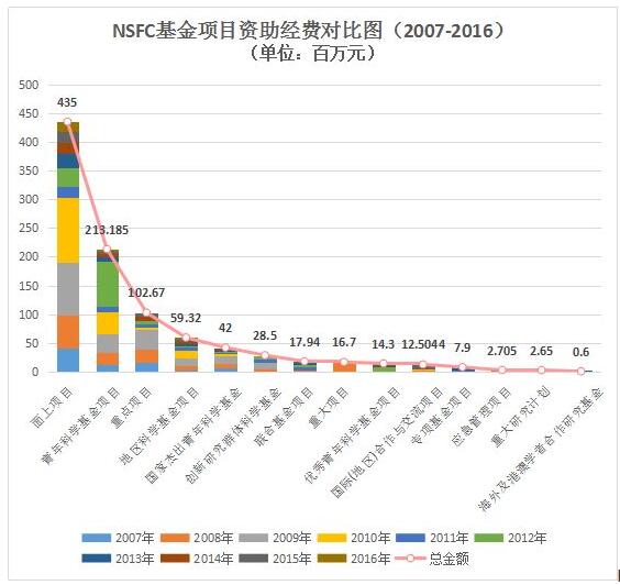 圖10國家自然科學基金項目資助經(jīng)費對比圖(2007-2016年)
