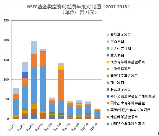 圖11國家自然科學基金基金類型資助經(jīng)費年度對比圖(2007-2016年)