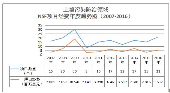 通過項目數(shù)據(jù)分析(見圖12),在土壤污染防治領域,美國國家科學基金資助經(jīng)費在2007年至2009年呈現(xiàn)了穩(wěn)步遞增的趨勢,2009年項目數(shù)量達到峰值30個。2010年出現(xiàn)拐點,項目數(shù)量下降為8個,2011年又開始回升,之后5年一直較為平穩(wěn),2016年有所增加,達到21個。