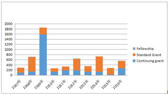 表8美國國家科學基金項目資助類型經(jīng)費表(2007-2016年)