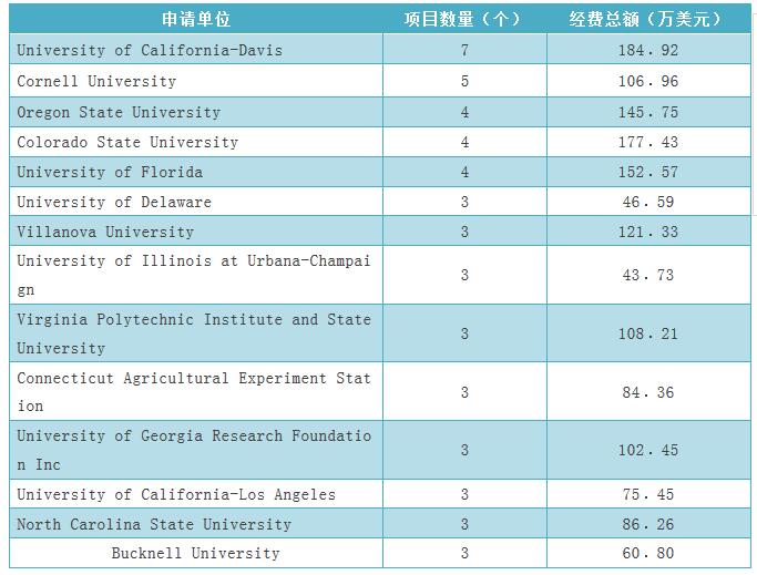 根據(jù)統(tǒng)計,本領域申請年份在2007年至2016年間,共有135個機構申請了美國國家科學基金。其中申請數(shù)量超過2個的機構有14個獲得經(jīng)費約為1496.8萬美元,如表9所示。
