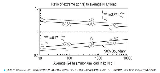 下圖總結(jié)了不同污水收集方式下氨的極端負荷和日平均負荷的比值。由于硝化處理設計的安全系數(shù)通常按照最大負荷和平均負荷的比值來設定,因此該圖能提供重要的設計信息。根據(jù)此圖,我們會發(fā)現(xiàn)安全系數(shù)的選定是個很有趣的事情——安全系數(shù)(也就是相應的SRT)設定越大,污水廠的處理能力就變小,因此專業(yè)性就降低,而且更加難以運行。