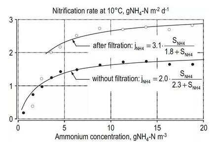 活性污泥工藝的硝化菌表面莫諾飽和系數(shù)大于MBR系統(tǒng)。但是Manser等人認為對于這個差別可以由傳質(zhì)作用解釋:活性污泥的絮體要比MBR的大,更長的擴散路徑導致更大的表面飽和值,因此這些動力學參數(shù)跟系統(tǒng)特性相關(guān)的。