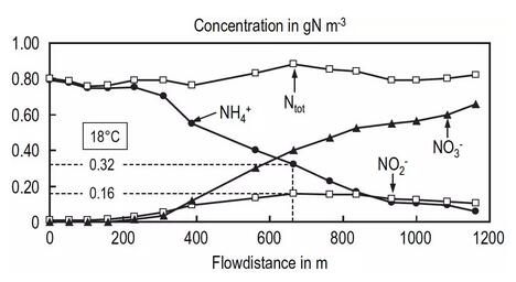 Gujer教授強調(diào),僅僅能夠預測污水的硝化表現(xiàn)是不夠的,更重要的是要弄清出水中氮的最終去向。下圖展示的是某富營養(yǎng)化湖泊的厭氧出水排入一條小溪后,其中的氮轉(zhuǎn)化達到接近靜態(tài)的所需距離。我們需要充足的空間才能發(fā)現(xiàn)自然凈化的數(shù)據(jù)。