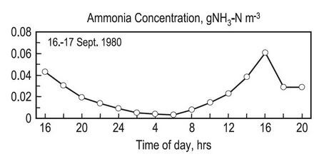 又如下圖所示,在距離某部分硝化的污水廠出水口1.5km的某河里的氨氮濃度晝夜差異。溫度、pH和氨氮負荷受到陽光的同步作用導致了這里的有毒物質(zhì)濃度的極端變化。