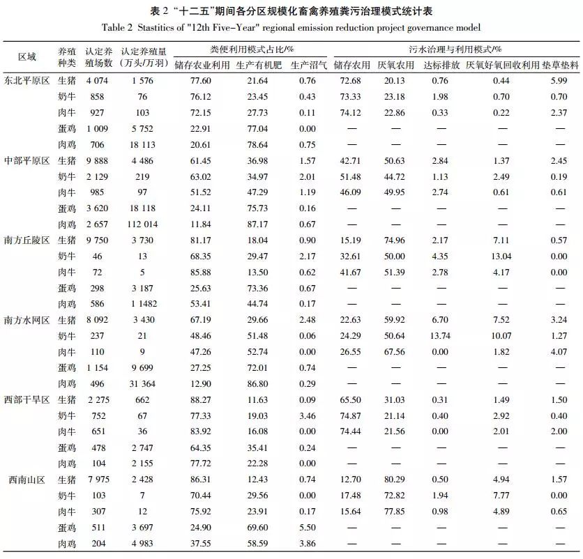 參考代思汝對我國畜禽養(yǎng)殖污染防治模式分區(qū)研究,根據(jù)我國農(nóng)業(yè)經(jīng)濟(jì)自然條件,結(jié)合我國畜禽養(yǎng)殖分布和糞污治理現(xiàn)狀,將我國(不包含港澳臺、西藏以及南沙群島)分為6個(gè)區(qū),分別為:東北平原區(qū)、中部平原區(qū)、南方丘陵區(qū)、南方水網(wǎng)區(qū)、西部干旱區(qū)、西南山區(qū),按分區(qū)對規(guī)模化畜禽養(yǎng)殖糞污治理模式進(jìn)行統(tǒng)計(jì),結(jié)果如表2。