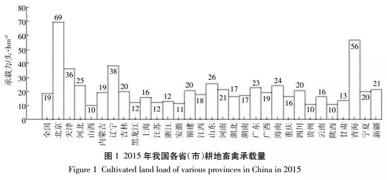 根據(jù)生豬當(dāng)量產(chǎn)氮量系數(shù)折算,換算比例為7.4只蛋雞、61.7只肉雞折算為一頭豬,一頭奶牛折算為28.59頭豬,一頭肉牛折算為19.14頭豬。通過查閱2016年《中國畜牧業(yè)年鑒》和《中國國家統(tǒng)計(jì)年鑒》,2015年我國農(nóng)作物播種面積為166374000hm2,2015年年末折算生豬當(dāng)量養(yǎng)殖量為308305萬頭,我國現(xiàn)有耕地畜禽承載量平均為19頭˙hm-2。同時(shí)對我國各省地區(qū)之間的畜禽承載量進(jìn)行了統(tǒng)計(jì)分析,如圖1。