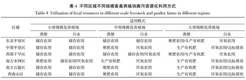 通過總結(jié)現(xiàn)有養(yǎng)殖場糞污資源化利用的經(jīng)驗(yàn)與存在的問題,根據(jù)各區(qū)域特點(diǎn),優(yōu)選適合各區(qū)域不同規(guī)模畜禽養(yǎng)殖場糞污資源化利用方式,如表4。