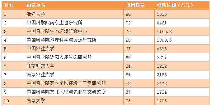 通過項(xiàng)目數(shù)據(jù)分析(見圖10),土壤污染防治領(lǐng)域在面上項(xiàng)目獲得的經(jīng)費(fèi)十年總經(jīng)費(fèi)額度排名第一,共計(jì)4.35億元,青年科學(xué)基金項(xiàng)目排名第二,約為2.13億元。排名第三位的為重點(diǎn)項(xiàng)目,共計(jì)1.02億元。面上項(xiàng)目是相對于重點(diǎn)項(xiàng)目而言,由于選題廣泛所以占比比其他類型要高。但是由于2013年起基金委出臺(tái)新政策,嚴(yán)格把控項(xiàng)目質(zhì)量。因此導(dǎo)致近幾年資助經(jīng)費(fèi)呈下降走勢。
