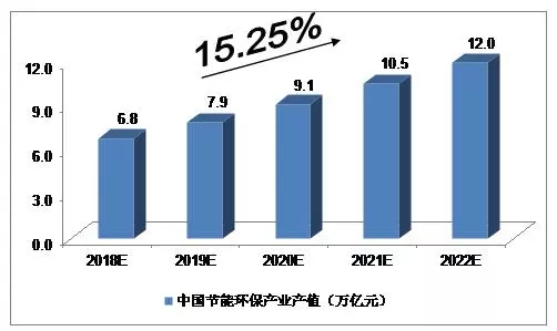 近年來(lái),國(guó)家利好政策不斷出臺(tái),明確提出要加快發(fā)展先進(jìn)環(huán)保產(chǎn)業(yè),積極推廣應(yīng)用先進(jìn)環(huán)保產(chǎn)品,促進(jìn)環(huán)境服務(wù)業(yè)發(fā)展。在此背景下,業(yè)內(nèi)預(yù)計(jì),2018年我國(guó)節(jié)能環(huán)保產(chǎn)業(yè)產(chǎn)值將達(dá)到6.8萬(wàn)億元,未來(lái)五年(2018-2022)年均復(fù)合增長(zhǎng)率約為15.25%,2022年將達(dá)到12.0萬(wàn)億元。