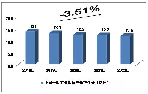2015年,246個(gè)大、中城市一般工業(yè)固體廢物產(chǎn)生量達(dá)19.1億噸;2016年,214個(gè)大、中城市一般工業(yè)固體廢物產(chǎn)生量達(dá)14.8億噸。我們預(yù)計(jì),2018年中國(guó)一般工業(yè)固體廢物產(chǎn)生量將達(dá)到13.8億噸,未來(lái)五年(2018-2022)行業(yè)年均復(fù)合增長(zhǎng)率約為-3.51%,2022年達(dá)到12.0億噸。