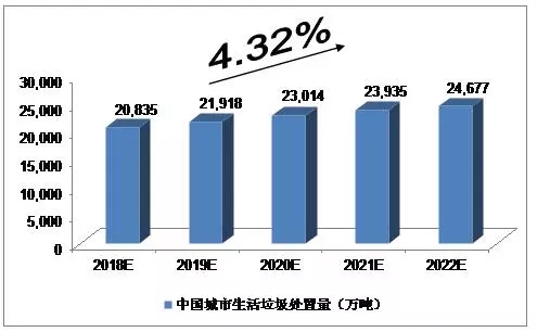 2015年,246個(gè)大、中城市生活垃圾產(chǎn)生量為18,564.0萬(wàn)噸;2016年,我國(guó)214個(gè)大、中城市生活垃圾產(chǎn)生量18,850.5萬(wàn)噸。我們預(yù)計(jì),2018年中國(guó)城市生活垃圾產(chǎn)生量將達(dá)到20,981萬(wàn)噸,未來(lái)五年(2018-2022)行業(yè)年均復(fù)合增長(zhǎng)率約為4.25%,2022年達(dá)到24,778萬(wàn)噸。