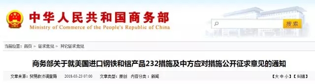商務(wù)部關(guān)于就美國(guó)進(jìn)口鋼鐵和鋁產(chǎn)品232措施及中方應(yīng)對(duì)措施公開(kāi)征求意見(jiàn)的通知