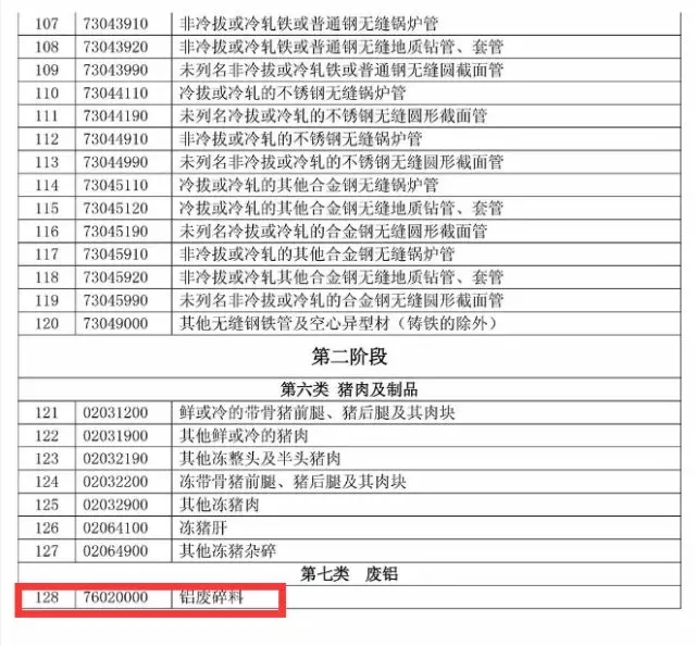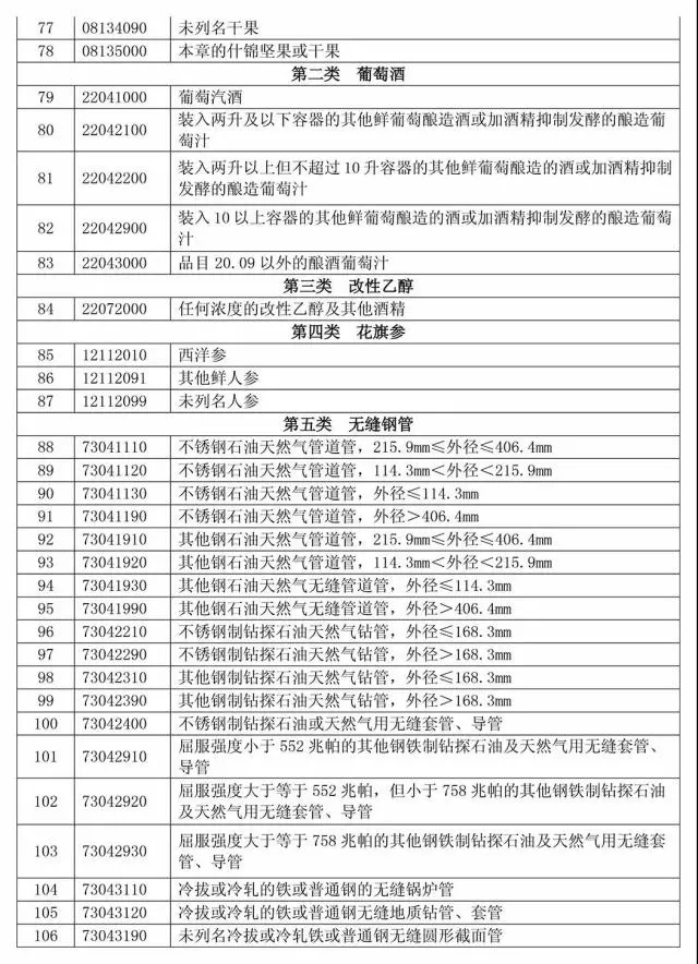 該清單暫定包含7類(lèi)、128個(gè)稅項(xiàng)產(chǎn)品,按2017年統(tǒng)計(jì),涉及美對(duì)華約30億美元出口。第一部分共計(jì)120個(gè)稅項(xiàng),涉及美對(duì)華9.77億美元出口,包括鮮水果、干果及堅(jiān)果制品、葡萄酒、改性乙醇、花旗參、無(wú)縫鋼管等產(chǎn)品,擬加征15%的關(guān)稅。第二部分共計(jì)8個(gè)稅項(xiàng),涉及美對(duì)華19.92億美元出口,包括豬肉及制品、回收鋁等產(chǎn)品,擬加征25%的關(guān)稅。