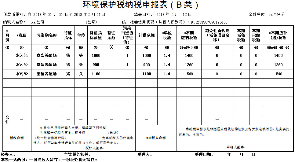 7. 環(huán)境保護稅納稅申報表(B表):適用于除A類申報之外的其他納稅人,包括按次申報納稅人、適用環(huán)境保護稅法所附《禽畜養(yǎng)殖業(yè)、小型企業(yè)和第三產(chǎn)業(yè)水污染物當(dāng)量值》表的納稅人和采用抽樣測算方法計算污染物排放量的納稅人。