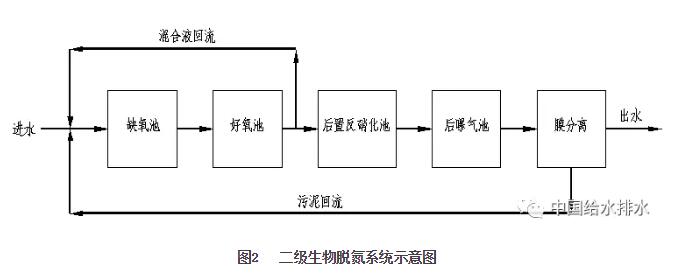 事實上經(jīng)過單級生物脫氮處理后,出水中仍會含有一定量的硝酸鹽,尤其是進水氨氮濃度高的情況下,出水中硝酸鹽的含量會更高,總氮也相應偏高。在出水對總氮有嚴格要求的地區(qū),為保證出水總氮達標,在單級生物脫氮后再增設后置反硝化池和后曝氣池,亦即二級生物脫氮系統(tǒng),通過投加外加碳源,利用微生物的硝化和反硝化反應進一步去除剩余的硝酸鹽,進而達到提高總氮去除率的目的。