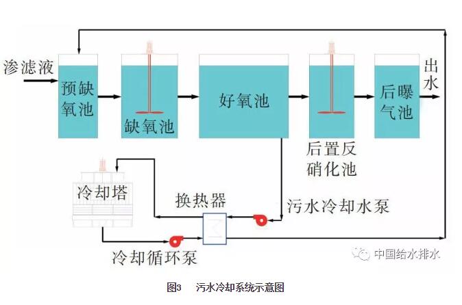 由于高濃度污水在生化反應過程中會釋放出大量的熱能,同時由于部分電能轉(zhuǎn)化成熱能的緣故,垃圾滲濾液處理生物池內(nèi)會保持較高的溫度,過高的水溫會抑制微生物的活性,嚴重時會使生化處理系統(tǒng)癱瘓。因此垃圾滲濾液生化處理均設有污水冷卻系統(tǒng),用污水泵抽取生物池內(nèi)的混合液進入換熱器,與冷卻水在換熱器內(nèi)進行熱交換,降溫后混合液再回到生物池內(nèi),從而達到降低生物池內(nèi)水溫的目的。