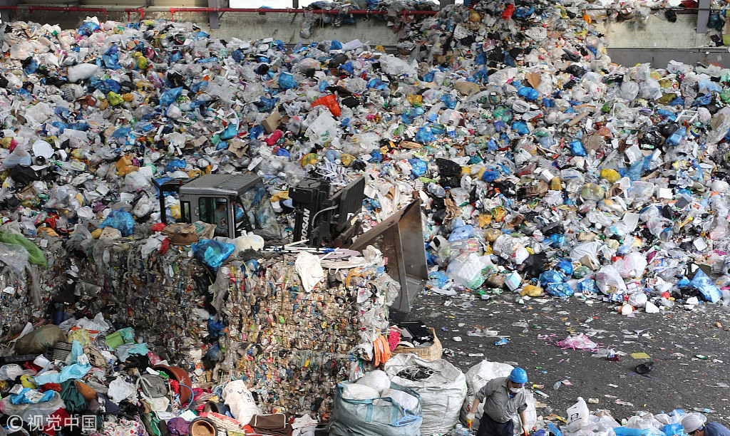 當(dāng)?shù)貢r(shí)間2018年4月2日,韓國(guó)京畿道光明市,回收垃圾堆積成山。(圖源:視覺中國(guó))