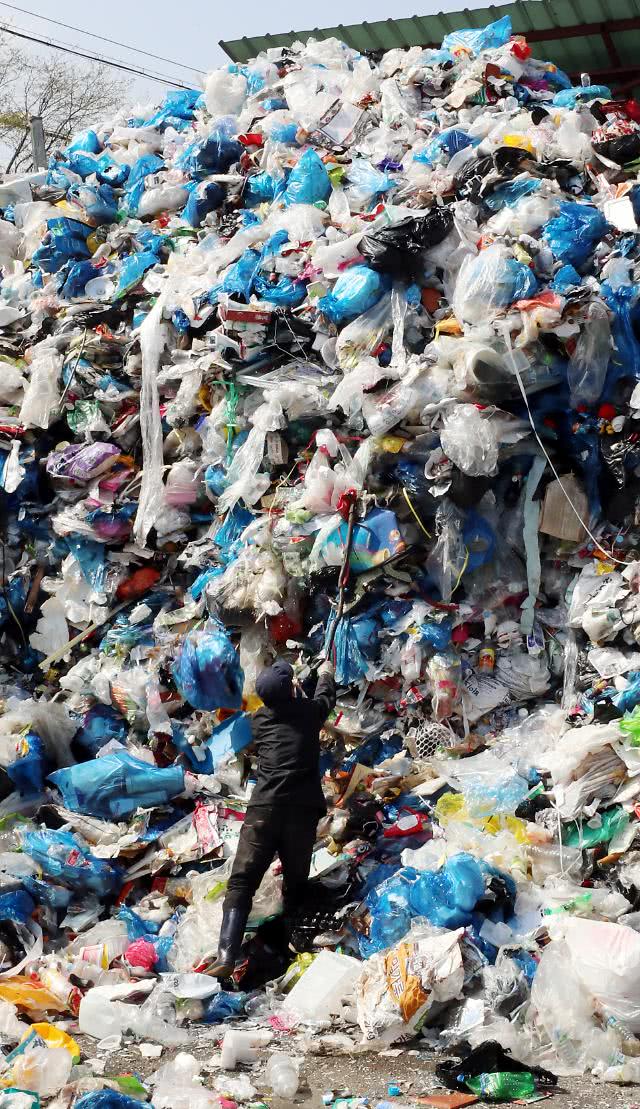 2日上午,韓國(guó)光州垃圾場(chǎng)中,未處理的回收垃圾堆成山。(圖源:韓媒)