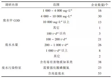 本次調(diào)研主要內(nèi)容和結(jié)果見表1。調(diào)研情況表明,企業(yè)普遍存在排污量大,企業(yè)廢水排放量在200~1000t/d之間的企業(yè)數(shù)占調(diào)查總數(shù)的43%,其中有8家企業(yè)排污量超過1000t/d?;て髽I(yè)不僅排污量大,污染物濃度也普遍較高。處理前COD質(zhì)量濃度在1000~2000mg/L的企業(yè)占比為27%,大約有50%的企業(yè)的污水COD質(zhì)量濃度在4000~8000mg/L,此外還有22%的企業(yè)污水COD質(zhì)量濃度超過10000mg/L,進水COD濃度高給污染治理帶來很大難度。
