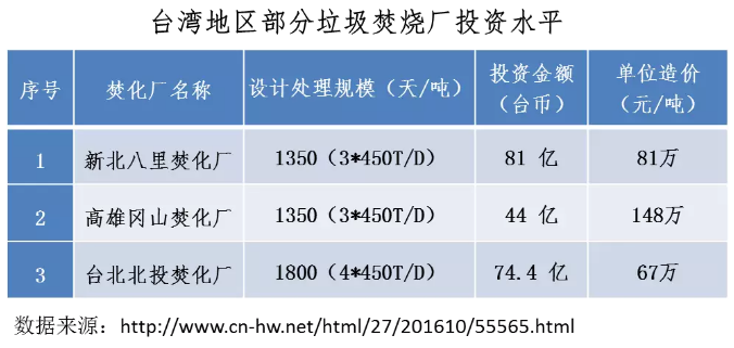 相較于目前大陸地區(qū)采用爐排爐工藝的垃圾焚燒電廠的噸投資成本(穩(wěn)定在40-52萬元)1,臺(tái)灣地區(qū)垃圾焚燒廠的單位造價(jià)成本遠(yuǎn)高于大陸地區(qū)平均投資水平。