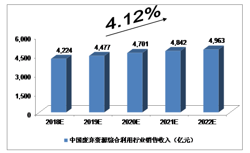 我們預(yù)計(jì),2018年中國(guó)廢棄資源綜合利用行業(yè)銷售收入將達(dá)到4,224億元,未來(lái)五年(2018-2022)年均復(fù)合增長(zhǎng)率約為4.12%,2022年將達(dá)到4,963億元。