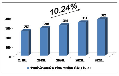 我們預(yù)計(jì),2018年中國(guó)廢棄資源綜合利用行業(yè)利潤(rùn)總額將達(dá)到259億元,未來(lái)五年(2018-2022)年均復(fù)合增長(zhǎng)率約為10.24%,2022年將達(dá)到382億元。
