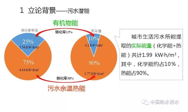 今天我的發(fā)言既與碳中和有關(guān)也跟磷回收有關(guān)。那么,關(guān)于碳中和談得是污水處理的耗能過程,有機(jī)物及氮磷去除要消耗能量,碳中和即需要從污水處理廠或污水里找到能量去彌補(bǔ)能耗。對此,大家更多會想到剩余污泥里有大量含能有機(jī)物,這也是我們搞污水處理人所關(guān)注的,所以,污泥厭氧消化從傳統(tǒng)到現(xiàn)在,以至于有更多的人前赴后繼對厭氧消化進(jìn)行優(yōu)化提高其能量轉(zhuǎn)化效率,包括前處理,比如說,高碑店現(xiàn)在的熱水解,就是希望最大化把污泥中的有機(jī)能源轉(zhuǎn)化出來。但是,我們搞污水處理的人忽視了一個問題,就是說除了有機(jī)物形成的化學(xué)能以外,還有大量污水中的余溫?zé)崮?。請大家看這個圖,有機(jī)物中的化學(xué)能與污水中余溫?zé)崮芟啾?,很少、很少。理論上一個75%,一個25%。也就是說污泥中有機(jī)物的化學(xué)能只占整個污水中潛能的25%,75%是熱能。我們給大家先看這樣一個概念,也就是說我們所關(guān)注的厭氧消化轉(zhuǎn)化的能源占整個污水中的潛能,理論值是25%。那么這25%的有機(jī)能源又能轉(zhuǎn)化多少呢?顯然這是個理論值,不可能100%轉(zhuǎn)化。