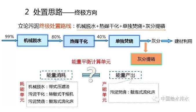 因此,最后只有去“燒”!但是,“燒”必須要經(jīng)過機(jī)械脫水,含水率99%的污泥首先降至80%;然后,再熱干化到40%以下。到40%就可以自持燃燒了。燒,但污泥焚燒千萬不能放在水泥窯中同水泥一塊燒。這樣不對。會把磷就全部固定在水泥里,磷再也不能回用了!所以,要單獨(dú)燒。最多可以跟有機(jī)垃圾一塊燒。燒完以后,大量的磷都在灰分里面,需要提取。當(dāng)然了,大家知道,脫水、熱干化、單獨(dú)焚燒都是要輸入能量的,當(dāng)焚燒之后也會產(chǎn)生能量?,F(xiàn)在我們有一個問題,就是輸入能量和產(chǎn)生的能量能否達(dá)到平衡?我們需要計算一下,如果能打個平手那就是很了不起的事了。