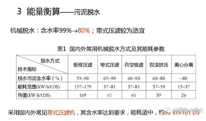 接下來我們看一下計算結(jié)果。大家知道,機(jī)械脫水有各種各樣的方法,99%~80%,這里列了很多技術(shù)與設(shè)備,我也不一一匯報了。常見的是帶式壓濾機(jī),能達(dá)到80%含水率的要求,所以,我們就以帶式壓濾機(jī)為例進(jìn)行計算,大概耗能折合成干固體每噸是60千瓦小時,即,60度電。熱干化,也就是從80%~40%,我知道搞干化設(shè)備的人有很多,到40%以后基本上就可以自持燃燒了。干化的時候輸入熱能進(jìn)行蒸發(fā),所需熱量一個是用于污泥中水分升溫繼而蒸發(fā)的熱量,還有就是污泥升溫的熱量。