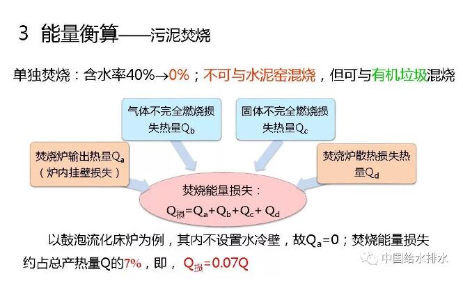 單獨(dú)焚燒,含水率40%~0%。不可與水泥窯混燒,但可與有機(jī)垃圾混燒。焚燒有熱量損失,焚燒爐輸出的熱量,比如說爐內(nèi)壁掛損失、焚燒爐散熱損失等等,所有損失加在一起,以鼓泡流化床為例,大概就是7%,即占焚燒產(chǎn)生熱量的7%,這都是有文獻(xiàn)可查的。污泥焚燒也產(chǎn)生熱量,這個熱量主要跟有機(jī)質(zhì)有關(guān),這個是計算公式。我們國家有機(jī)質(zhì)含量比較低,在30%~60%的范圍,我們計算時取污泥有機(jī)質(zhì)含量中間值53%,北京大概是60%。計算污泥燃燒熱為1.2GJ/kgDS。這是不同國家污泥燃燒值,中國大概在個范圍,平均是11850kJ/kgDS。我們的計算跟這個1.185GJ/kgDS基本接近,這都是從文獻(xiàn)來的數(shù)據(jù)。這樣經(jīng)過計算以后,污泥脫水+干化+焚燒,脫水要輸入能量,干化要輸入能量,焚燒產(chǎn)生能量;最后的結(jié)果會發(fā)現(xiàn)總耗能是3091度電每噸干固體??偖a(chǎn)能11.1GJ,利用熱電聯(lián)產(chǎn)轉(zhuǎn)換為電當(dāng)量為2467度電。也就是說整個工藝的能量輸入為624度電。下面是詳細(xì)的計算表,不講了。