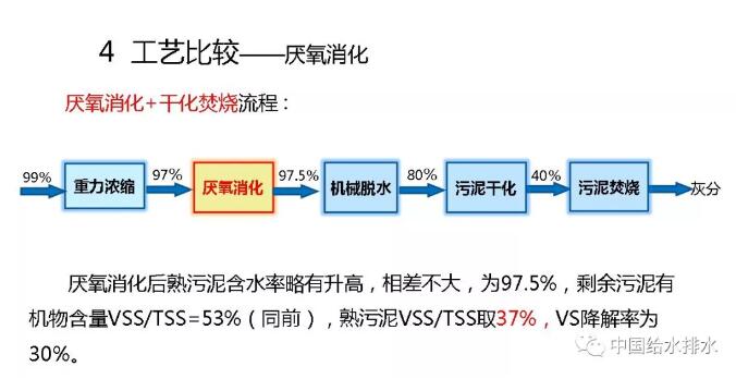 第二個比較就是跟傳統(tǒng)厭氧消化進(jìn)行比較。傳統(tǒng)厭氧消化前面有重力濃縮,含水率99%~97%,然后厭氧消化,含水率再略微增加一點(diǎn)點(diǎn)。因為厭氧消化之后至少還有60%左右的有機(jī)物殘留,你還得脫水、干化。干化后污泥焚燒是跑不掉的。大家看一下,我們厭氧消化以后含水率按97.5%計,剩余污泥有機(jī)物含量是53%,熟污泥VSS/TSS是37%。