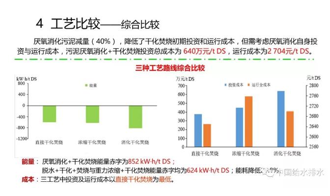 最后,把我們推薦工藝與重力濃縮后再機(jī)械脫水、干化焚燒工藝,以及傳統(tǒng)厭氧消化后干化焚燒工藝進(jìn)行一下比較。直接干化焚燒能量消耗是最小的。從投資和運(yùn)行成本來看,無論是投資成本、運(yùn)行費(fèi)用,在這三個比較中都是最低的。