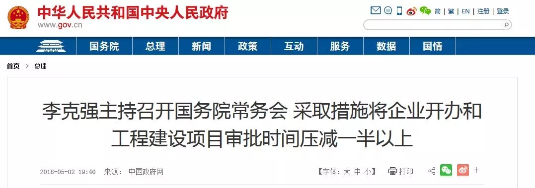 國(guó)務(wù)院總理李克強(qiáng)5月2日主持召開(kāi)國(guó)務(wù)院常務(wù)會(huì)議,采取措施將企業(yè)開(kāi)辦時(shí)間和工程建設(shè)項(xiàng)目審批時(shí)間壓減一半以上,進(jìn)一步優(yōu)化營(yíng)商環(huán)境;